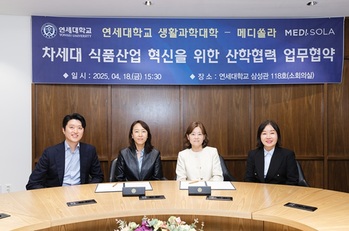 연세대학교 생활과학대학은 지난 18일 교내 삼성관에서 메디쏠라와 차세대 식품산업 혁신을 위한 산·학 협력 업무협약을 맺었다고 24일 밝혔다.양 기관은 급식 모델 프로세스 혁신과 산업 구조 개선, 인력·지식·기술 교류에 역점을 두고 협력을 강화하기로 했다. 메디쏠라의 기