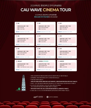 중앙대학교는 다음 달 24일부터 전국 주요 도시에서 2026학년도 입학설명회 'CAU WAVE CINEMA TOUR'를 연다고 23일 밝혔다.이번 설명회는 서울·부산·대구·광주 등 전국 10개 도시, 11개 롯데시네마 지점에서 진행한다.설명회에선 △2026학년도 전형계