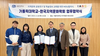 가톨릭대학교는 지난 10일 교내 미카엘관 HB106호에서 한국지역문화학회와 '지역문화 공동연구와 학술정보 교류를 위한 업무협약'을 맺었다고 17일 밝혔다.이날 협약식에는 가톨릭대 임학순 성심대학원장, 김경호 교수, 허효미 RISE(지역혁신중심 대학지원체계)사업운영팀장과