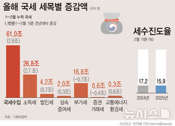 올해 2월까지 누적 국세수입이 지난해 동기간보다 2조9000억원 증가했다. 다만 세수 실적 '속도'는 30조8000억원 규모의 '세수 펑크'를 냈던 작년보다 낮아 3년 연속 세수 결손의 불안감을 해소하지는 못했다.기획재정부가 31일 발표한 '2025년 2월 국세수입 현