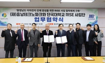 단국대학교 천안캠퍼스 지역혁신중심 대학지원체계(RISE) 사업단과 충남테크노파크가 충남지역 이차전지 산업의 미래를 이끌어갈 인재 양성에 힘을 모으기로 했다.양 기관은 28일 충남TP 천안밸리에서 충남 RISE 사업의 성공적인 추진을 위한 업무협약(MOU)을 맺고, 지역