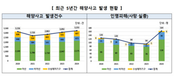 지난해 해양사고가 전년 대비 5.3% 증가했다. 같은 기간 사망·실종자는 164명에 달해 세월호 참사가 있었던 2014년 이후 10년만에 인명 피해가 가장 컸다. 24일 해양수산부 중앙해양안전심판원이 발표한 '2024년 해양사고 통계'에 따르면 지난해 해양사고