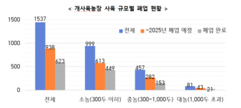 '개의 식용 목적의 사육·도살 및 유통 등 종식에 관한 특별법(개식용종식법)' 시행 반년 만에 개사육농장 10곳 중 4곳이 폐업한 것으로 집계됐다.농림축산식품부는 전체 개사육농장(1537호)의 40%에 달하는 623호가 폐업했으며 올해까지 총 60% 가량(938호) 폐