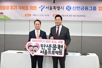 서울시가 신한금융그룹과 함께 미혼남녀의 만남부터 다자녀 양육에 이르기까지 생애주기별 저출생 정책 패키지를 추진한다.시는 5일 시청에서 오세훈 시장과 진옥동 신한금융그룹 회장이 '저출생 위기극복 업무협약'을 맺었다고 밝혔다.지난 2022년부터 저출생 극복을 위해 '탄생응