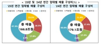 지난해 온라인 유통 매출 비중이 50%를 넘어 역대 최고치를 기록했다. 산업통상자원부는 23일 이 같은 내용을 '2024년 주요 유통 업체 매출 동향' 통계를 발표했다. 지난해 주요 유통 업체 매출은 179조1000억원으로 온·오프라인 부문이 모두 성