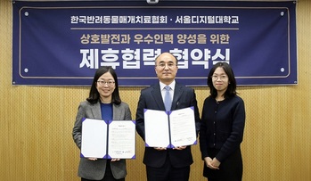 서울디지털대학교 반려동물전공은 13일 한국반려동물매개치료협회(이하 협회)와 반려동물 매개치료 활성화, 전문 인재 양성을 위한 업무협약(MOU)을 맺었다고 밝혔다.앞으로 양 기관은 △반려동물 매개치료 관련 교육 프로그램 개발 △전문 인력 양성을 위한 맞춤형 자격증 과정