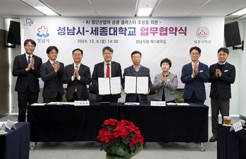 세종대학교는 지난 9일 경기도 성남시청 제1회의실에서 성남시와 4차 산업혁명 핵심 기술인 인공지능(AI)과 시스템반도체 산업의 발전을 위한 업무협약을 맺었다고 11일 밝혔다.양측은 이날 AI 첨단산업의 상생 클러스터 조성을 위해 협력하기로 약속했다. 업무협약 주요 내용