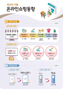 지난 10월 온라인쇼핑 거래액이 전년 대비 0.6% 늘어나는 데 그친 것으로 나타났다. 이는 2017년 조사 이래 가장 낮은 증가세로 내수 침체에 티몬·위메프(티메프) 정산 지연 사태가 겹친 결과로 풀이된다.2일 통계청이 발표한 온라인쇼핑 동향에 따르면 10월 온라인쇼