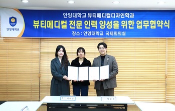 안양대학교 뷰티메디컬디자인학과는 지난달 27일 교내 일우중앙도서관 5층 국제회의실에서 한국화장품전문가협회와 화장품 분야 전문인력 양성을 위한 업무협약을 맺었다고 1일 밝혔다.이날 업무협약식에는 뷰티메디컬디자인학과 이여진 학과장과 위서현 교수, 화장품전문가협회 양종윤 사