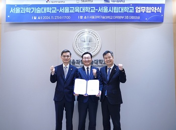 서울과학기술대학교는 지난달 27일 대학본부 3층 대회의실에서 서울교육대학교, 서울시립대학교와 학술교류 등을 통한 상호 발전을 도모하기로 협약을 맺었다고 1일 밝혔다.협약식에는 김동환 서울과기대 총장, 장신호 서울교대 총장, 원용걸 서울시립대 총장을 비롯해 각 대학 관계