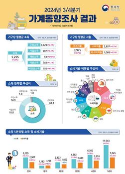 올해 3분기(7~9월) 국내 가구는 월평균 525만5000만원을 벌고 397만5000원을 쓴 것으로 나타났다.29일 통계청이 발표한 2024년 3분기 가계동향조사 결과에 따르면 3분기 가구당 월평균 소득은 525만5000원으로 전년 동기 대비 4.4% 증가했다. 전분기