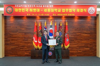 세종대학교가 지난 22일 경기도 화성시 해병대사령부 대회의실에서 대한민국 해병대와 국방과학기술 분야 전문인력 육성과 발전을 위한 업무협약을 맺었다고 24일 밝혔다. 협약식에는 세종대 엄종화 총장, 홍우영 부총장, 김계환 해병대사령관 등이 참석했다.이번 협약으로 세종대와