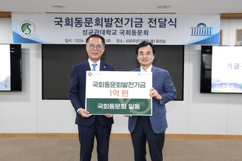 성균관대학교는 성균관대 국회동문회가 10일 서울 종로구 성균관대 600주년기념관에서 국회동문회발전기금 1억 원을 기부했다고 밝혔다.이날 기금전달식에는 성균관대 국회동문회 회장인 안규백(동양철학과 82) 의원과 유지범 성균관대 총장, 박재완 학교법인 성균관대학 이사장 등