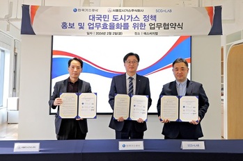 한국가스공사는 지난 2일 서울도시가스, 에스씨지랩과 ‘대국민 도시가스 정책 홍보 및 업무 효율화를 위한 협약’을 맺었다고 5일 밝혔다. 이날 행사에는 문정상 가스공사 마케팅본부 에너지국민동행실장, 진용민 서울도시가스 기획조정부문 상무이사, 박동녘 에스씨지랩 대표이사 등