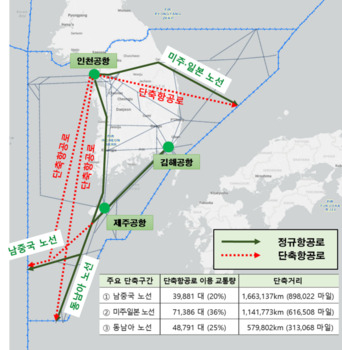 국토교통부는 지난해 국제선 36.2%가 단축항공로를 이용해 지구 96바퀴 비행거리를 줄였다고 1일 밝혔다.단축항공로는 군 비행이 없는 시간대 등 특정 조건에서 국방부와 협의해 사용할 수 있는 임시항공로를 말한다.국토부가 지난해 하늘길 운영을 분석한 결과 국제선 54만5