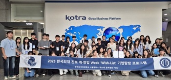 한국외국어대학교 대학일자리플러스본부는 지난 12일 총학생회와 함께 대한무역투자진흥공사(KOTRA) 기업탐방 프로그램을 진행했다고 29일 밝혔다.이번 행사는 '2025 진로 취·창업 Week' 프로그램의 하나로 마련됐다. 기업 현장을 직접 경험하면서 진로 준비에 필요한