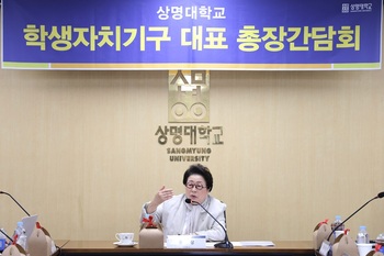 상명대학교는 김종희 신임 총장이 29일 서울캠퍼스에서 총학생회, 단과대학생회 등 학생회 대표와 간담회를 열었다고 밝혔다.이날 간담회에는 김 총장을 비롯해 김영준 서울캠퍼스 교학부총장, 이정아 학생처장, 김동근 기획조정처장, 이준영 대외협력처장, 구성본 총무처장 등 주요