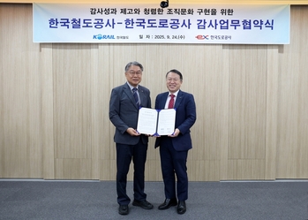 한국도로공사 감사처와 한국철도공사(코레일) 감사실이 '감사성과 제고와 청렴도 향상을 위한 업무협약'을 체결했다.양 기관은 24일 한국도로공사 본사에서 협약을 통해 △감사 전문성 제고 △전문분야 감사인력 지원 △감사 정보의 상호교환 △부패방지 및 청렴문화 개선을 위한 우