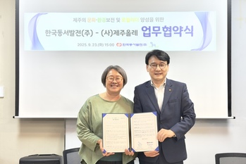 한국동서발전은 제주사업추진단과 (사)제주올레가 23일 서귀포 제주올레여행자센터에서 '제주의 문화·자연환경 보전 및 지역인재 양성을 위한 업무협약'을 체결했다고 24일 밝혔다.이날 협약식에는 제주특별자치도청 환경보전팀장, 제주특별자치도교육청 장학관 등 관계자 10여명이