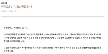 카카오가 2017년 출시한 통합 동영상 서비스 '카카오TV' 운영을 종료한다.카카오TV는 5일 공식 블로그를 통해 6월 30일부로 카카오TV 서비스를 종료한다고 공지했다. 카카오TV는 OTT와 인터넷 방송, 동영상 플레이어 등을 아우르는 종합 동영상 플랫폼이다.카카오