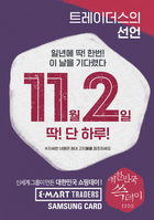 삼성카드는 이마트 트레이더스와 함께 '대한민국 쓱데이'를 맞아 11월 2일 하루 동안 다양한 할인 이벤트를 진행한다고 1일 밝혔다.먼저 전국 이마트 트레이더스에서 행사 가전 제품을 삼성카드로 결제하면 할인 혜택을 제공한다.THE UHD 65 TV는 20만원 할인된 37