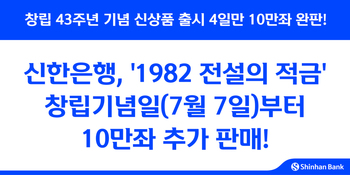 신한은행은 지난 7월1일 출시한 창립 43주년 기념 신상품 ‘1982 전설의 적금’이 4일만인 7월4일 10만좌 한도가 모두 소진돼 10만좌를 추가해 오는 7일부터 재판매한다고 6일 밝혔다.1982 전설의 적금은 매월 최대 30만원까지 입금할 수 있는 1년 만기 자유적