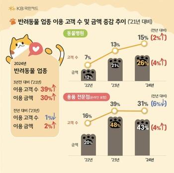 KB국민카드가 지난 2021년부터 2024년까지 반려동물 업종(동물병원, 용품 전문점)에서 이용 경험이 있는 354만 명의 결제 데이터 2485만 건을 분석한 결과, 지난해 반려동물 업종 이용 고객 수는 2021년 대비 39%, 이용 금액은 30% 각각 증가했다고 1일