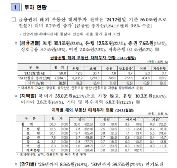 국내 금융권의 해외 부동산 대체투자 규모가 지난해 말 기준 56조원으로 집계됐다. 데이터센터 등 산업시설 중심의 대출이 늘며 직전 분기 대비 2000억원 증가했으나, 투자 자산의 건전성 악화로 부실 경고등은 여전히 꺼지지 않은 것으로 나타났다.금융감독원이 3일 발표한