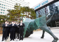 한국거래소는 5일 서울사옥 로비에 있던 ’소와 곰상‘을 옥외로 이전하고 제막식을 개최했다고 밝혔다. 거래소에 따르면 소와 곰상은 지난 1996년 최초 설치된 이후 현재까지 거래소 로비를 지켜왔으나, 건물 내부에 위치하고 있어 일반인들이 쉽게 접근하기 어려웠다.