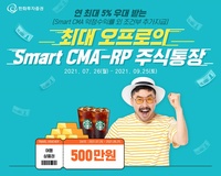 한화투자증권은 오는 9월 25일까지 '연 최대 5% 우대받는 Smart CMA RP 주식통장' 이벤트를 실시한다고 26일 밝혔다.이번 행사는 생애최초 비대면 신규 계좌개설 고객을 대상으로 누구나 참여 가능하다. 단 법인, 대주주, 임직원 등은 제외된다. 비대면