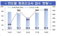 지난해 주식발행 건수는 전년과 비슷한 수준이었으나 금액은 11조원 줄어든 것으로 나타났다. 금융감독원은 20일 '2018년 증권신고서 분석 및 투자자 유의사항'을 발표하고 이같이 밝혔다.금감원에 따르면 지난해 증권신고서 접수 건수는 총 504건으로 전년(502
