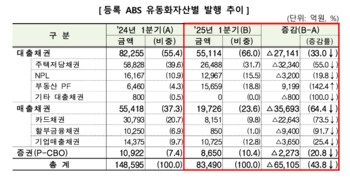 올해 1분기 자산유동화증권(ABS) 발행금액이 전년 동기 대비 감소한 것으로 나타났다.28일 금융감독원은 2025년 1분기 등록 ABS 발행금액이 8조3000억 원으로 집계됐다고 밝혔다. 주택저당채권(MBS) 발행이 크게 줄어들면서 전년 동기보다 43.8% 감소했다.유