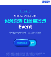 삼성증권은 내년 3월 16일까지 퇴직연금 디폴트옵션 시행에 맞춰 '당신의 퇴직연금, 디폴트옵션 ON or OFF' 이벤트를 진행한다고 22일 밝혔다.이벤트는 총 세 가지로, 이에 참여하려면 먼저 신청해야 한다.퇴직연금 DC형·IRP(개인형퇴직연금) 고객을 대상으로 퇴직