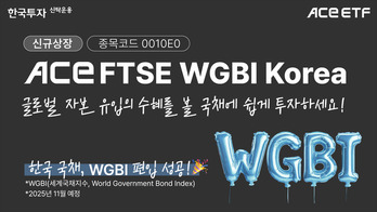 한국투자신탁운용은 오는 18일 'ACE FTSE WGBI Korea 상장지수펀드(ETF)'를 신규 상장한다고 17일 밝혔다.해당 상품은 만기가 다양한 한국 국채에 분산 투자가 가능한 채권 ETF이다. 한국 국고채 중 발행액 1조 원 이상의 수익성과 안정성을 갖춘 우수