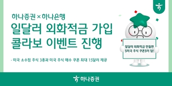 하나증권은 ‘하나은행 일달러 외화적금 가입’ 콜라보 이벤트를 오는 20일까지 진행한다고 7일 밝혔다.이번 이벤트는 하나은행과 협업을 통해 진행되며 '하나은행 일달러 외화적금'을 신규가입 하면 5달러 미국 주식 매수 쿠폰이 제공된다.하나증권·하나은행 손님 누구나 참여 가