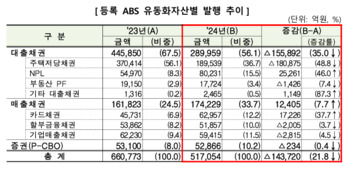 지난해 자산유동화증권(ABS) 발행금액이 전년 대비 감소한 것으로 나타났다. 한국주택금융공사의 주택저당증권(MBS) 발행이 급감한 영향이다.31일 금융감독원이 발표한 '2024년 ABS 등록발행 실적'에 따르면 지난해 ABS 발행액은 51조7000억 원으로 집계됐다.