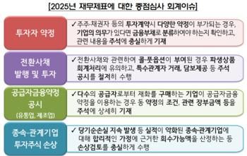 금융감독원이 올해 재무제표 심사 시 중점 점검할 회계이슈 4가지를 발표했다. 지난해 가상자산 회계처리 등이 새로 추가됐던 것과 달리 투자자 등에 대한 정확한 정보 제공에 중점을 뒀다.금융감독원은 23일 2025년 재무제표 심사 시 중점 점검할 회계이슈로 ▲투자자 약정