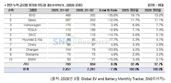 시장조사기관 SNE리서치는 올해 1~2월 글로벌 전기차(플러그인 하이브리드 포함) 인도량이 228만1천대로 집계되며, 전년 동기 대비 7.0% 감소했다고 8일 밝혔다. 각국의 정책 변화와 보조금 축소, 가격 경쟁 심화가 겹치면서 주요 시장인 중국과 북미에서 판매가 위축