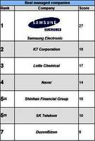 해외 투자 전문가들이 뽑은 '최우수 경영기업(Best Managed Company)' 평가에서 삼성전자가 압도적인 표차로 1위에 올랐다.아시아권 금융 전문 매체 '파이낸스 아시아(Finance Asia)'는 9일 아시아에서 활동하는 펀드매니저와 투자전문가, 애널리스트