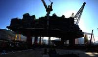 대우조선해양이 대형 덤프트럭 1500대와 맞먹는 무게의 해양설비를 지상 26m까지 가볍게 들어 올리며 해양플랜트 건조 기술력을 입증했다. 대우조선해양은 지난해 11월부터 진행해온 휘스스톤 고정식 플랫폼 상부구조물을 들어 올리는 작업(잭업, Jack Up)을 완료했다고