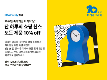 ◆이케아코리아, 이달 28일 10주년 기념 오프라인 전 제품 10% 할인이케아코리아가 한국 진출 10주년 기념 캠페인을 마무리하며 오는 28일 단 하루 전국 오프라인 매장에서 전 제품 10% 할인 혜택을 제공한다고 밝혔다.전 제품 10% 할인 행사는 이케아 무료 멤버십