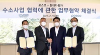 정의선 현대자동차그룹 회장과 최정우 포스코그룹 회장이 수소동맹을 맺었다. 정 회장과 최 회장은 16일 포항 포스코 청송대에서 만나 '수소 사업 협력에 관한 업무협약'을 체결했다.  양사는 수소트럭 등 수소전기차 1500대 공급, 연료전지 발전사업 공동