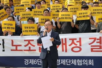 국내 경제계가 노란봉투법(노동조합법 2·3조 개정안) 총력 저지에 나섰다.한국경영자총협회 및 대한상공회의소·한국경제인협회·한국무역협회·중소기업중앙회·한국중견기업연합회 등 경제 6단체와 지방경총 및 업종별 단체는 19일 오후 김형동 국민의힘 의원과 함께 국회 본관 앞 계