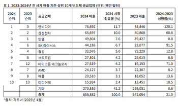 엔비디아가 삼성전자와 인텔 등 전통의 강자들을 제치고 지난해 반도체 최강자 자리에 올랐다. 삼성은 엔비디아에 이은 2위를 유지했고 SK하이닉스는 HBM(고대역폭메모리)에 힘 입어 두 단계 순위가 올라 4위에 안착했다.11일 시장조사업체 가트너에 따르면 지난해 전 세계