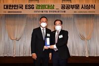 한국가스공사(사장 채희봉)가 대한민국 ESG 경영대상에서 공공부문 종합 우수기관상을 수상했다.14일 가스공사에 따르면 산업통상자원부·행정안전부가 후원하는 대한민국 ESG 경영대상 시상식이 지난 11일 개최된 가운데 가스공사가 기관이 제출한 공적조서와 평가단이 수집한 자