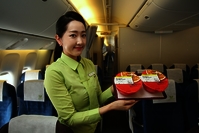 진에어가 이마트와 제휴해 만든 컵라면을 일부 노선에서 판매한다.진에어는 28일 이마트와 제휴해 PB상품으로 ‘컵면’을 출시했다고 밝혔다. ‘진에어 컵면’은 매운맛을 줄인 육개장 맛으로 어린이는 물론 어른들도 편하게 즐길