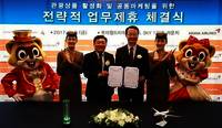 아시아나항공과 롯데월드가 손 잡고 관광객 유치를 위한 공동 마케팅에 나선다. 아시아나항공은 9일 롯데월드와 전략적 업무 제휴를 위한 MOU(양해각서)를 체결했다고 밝혔다. 이날 협약식은 잠실에 위치한 롯데월드타워 서울스카이 전망대에서 진행됐