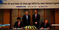 대한항공은 미국의 델타항공과 29일 그랜드하얏트인천 호텔에서 태평양 노선 조인트 벤처(JV) 운영과 관련된 양해각서(MOU)를 체결했다고 밝혔다.이날 체결식에는 조양호 한진그룹 회장과 조원태 대한항공 사장을 비롯해 에드 바스티안 델타항공 최고경영자 등이 참석했다.이번