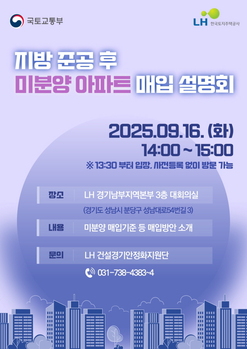 한국토지주택공사(LH)가 오는 16일 오후 2시 LH 경기남부지역본부 3층 대회의실에서 '지방 준공후 미분양아파트 매입 설명회'를 개최한다.11일 LH에 따르면 이번 설명회는 지난 8월 공고된 '2차 지방 준공후 미분양 아파트 매입공고'와 관련해 사업에 대한 건설사·시