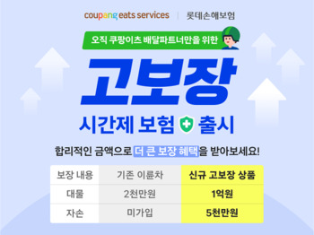 쿠팡이츠서비스(CES)가 롯데손해보험과 함께 이륜차 시간제 보험 보장 범위를 확대했다고 11일 밝혔다.쿠팡이츠서비스는 배달 수행 중 발생할 수 있는 다양한 사고로부터 파트너를 보호하기 위해 롯데손해보험과 보험 항목을 강화한 이륜차 대상 ‘고보장 시간제 보험’